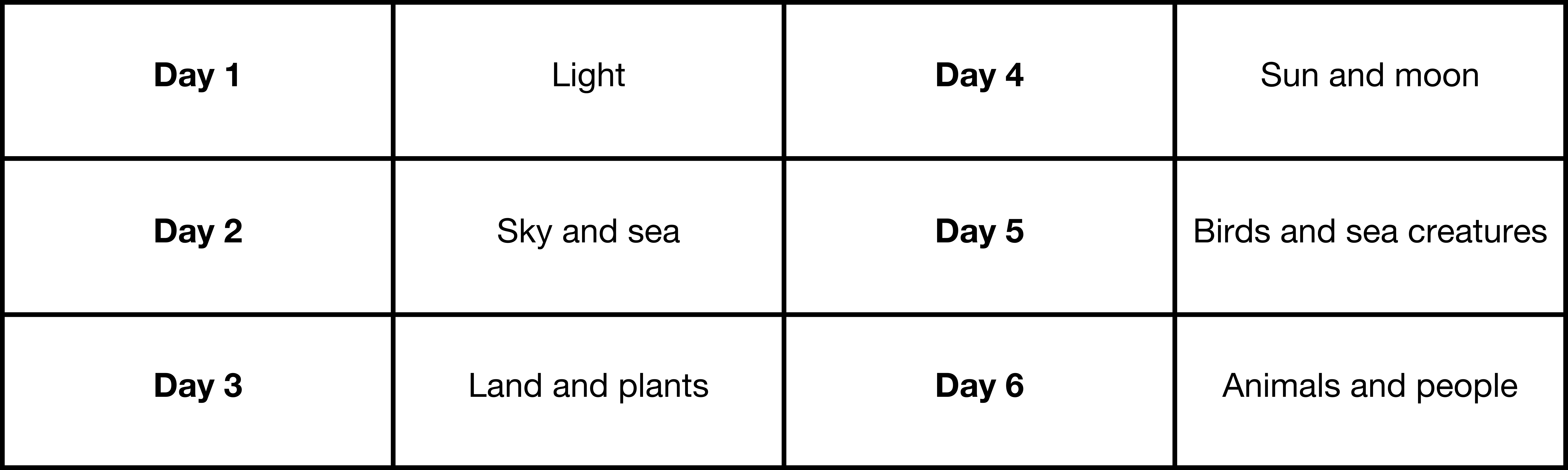 - What parallels can you spot between Psalm 104 and the six days of creation in Genesis 1? (You might want to print off copies of the table below for each person).