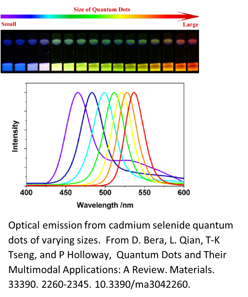 The diagram shows the optical emission from quantum dots of varying size, the resulting colours being easily predicted from quantum mechanics. Complex colouration arising from 3-dimensional structures on the 100 nm-scale is observed throughout living organisms, such as peacock feathers, butterflies and edelweiss flowers as well as some beetles, marine worms and jellyfish.
